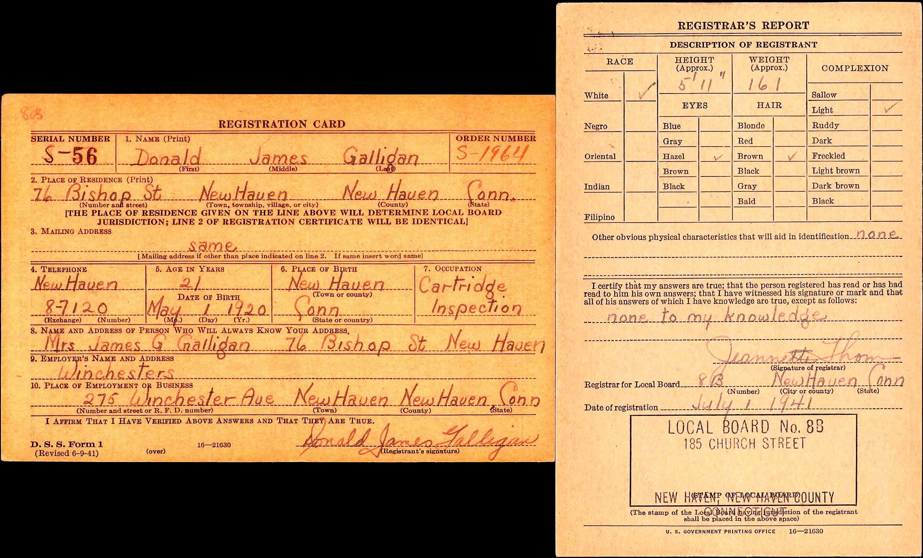1941 Draft Registration for Donald James GalliganIn his 1941 Draft Registration, Donald James Galligan: